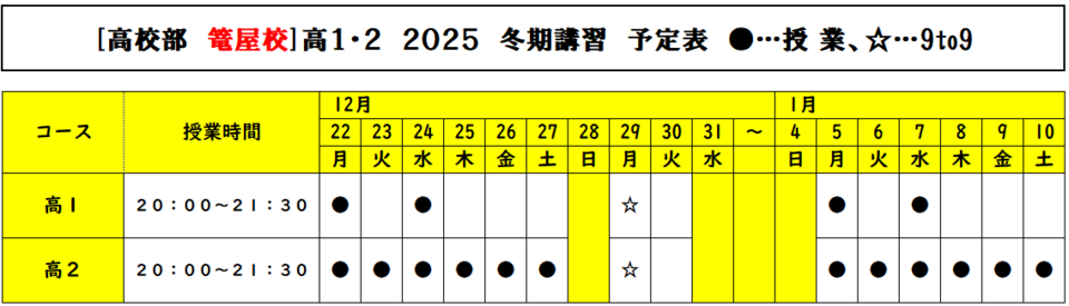 ※12月29日は9:00~21:00。高2は個別にスケジュール連絡します。