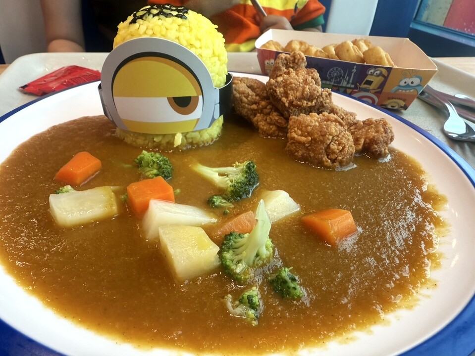 可愛さNo.1グルメは、「ミニオンランド」にあるレストランのミニオンカレーです。ちょっぴりスパイシーなので小さい子には早いかもしれませんが、味は間違いなく美味しい!噂どおり見た目も可愛くて、写真映えも抜群でした。