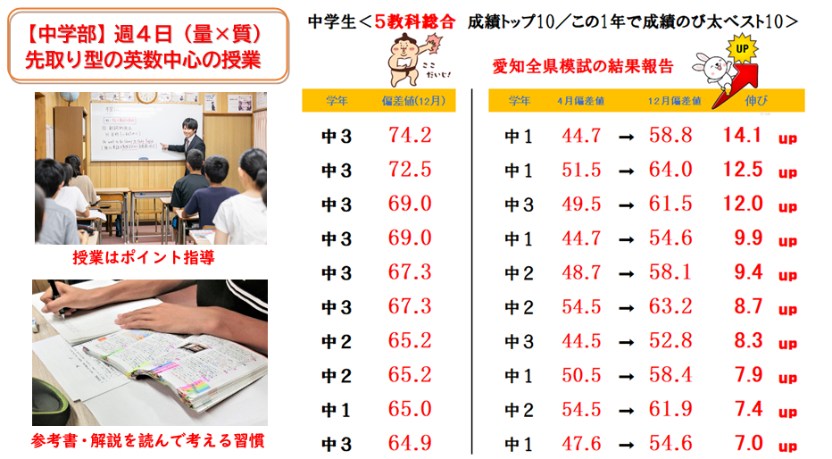 (↑【中学部】塾生の春と夏の5教科の成績推移!愛知全県模試の偏差値のび太くん!)