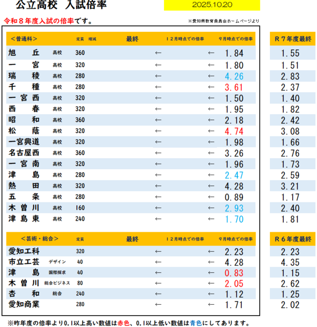愛知県教育委員会のホームページに、令和8年度入試の愛知県公立高校入試倍率(9月10日時点)が掲載されました。そのデータから地元の高校の倍率をここで共有したいと思います。