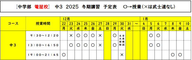 | 中3 | 12月30日(火)8:30~12:50 5教科¥4,200円 |