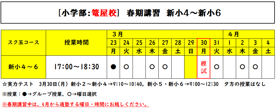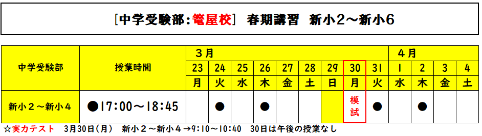 【篭屋校】2026年 春期講習(2月5日更新) 小学部・中学受験部
