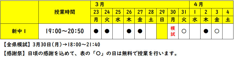 | 新中1 | 3月30日(月)18:00~21:40 | 5教科 | ¥4,200 |