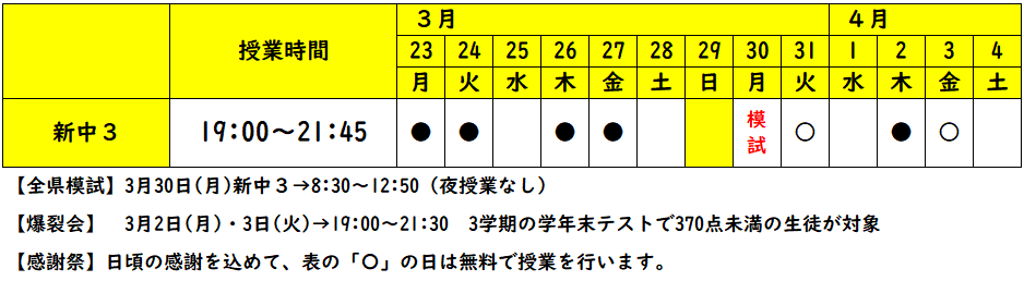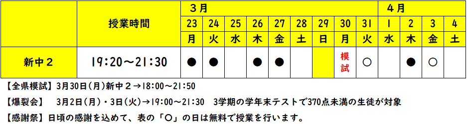 | 新中2 | 3月30日(月)18:00~21:50 | 5教科 | ¥4,200 |