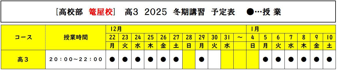 | 【篭屋校】高校3年 | 高3→25,300円(講習費23,100円+教材費2,200円) ※個別指導の授業日は個別に「予定表」にてお伝えします |