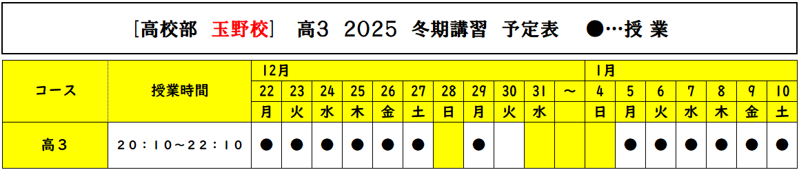 | 【玉野校】高校3年 | 高3→25,300円(講習費23,100円+教材費2,200円) ※個別指導の授業日は個別に「予定表」にてお伝えします |